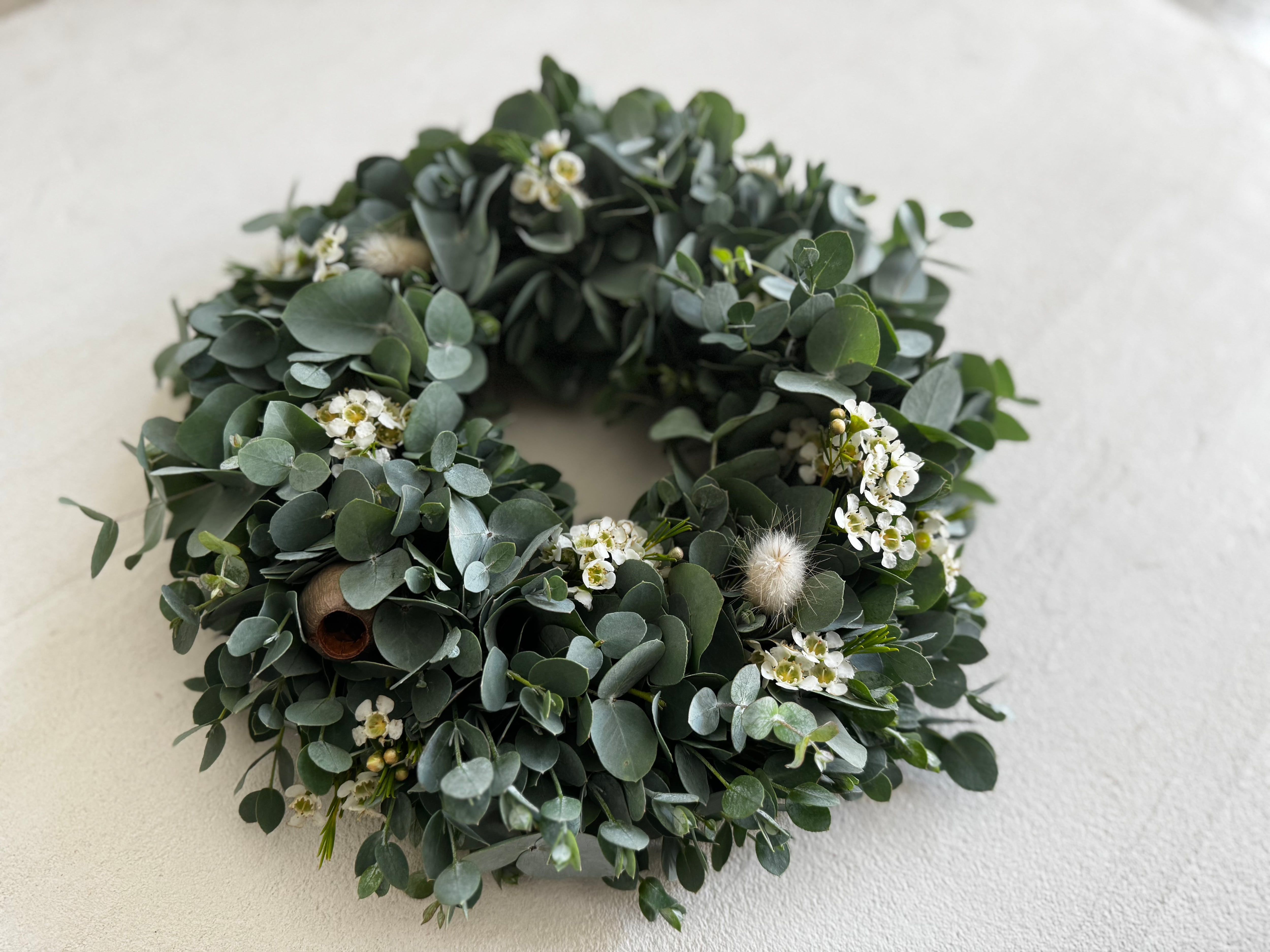 色んな種類のユーカリをリースに仕上げました。
