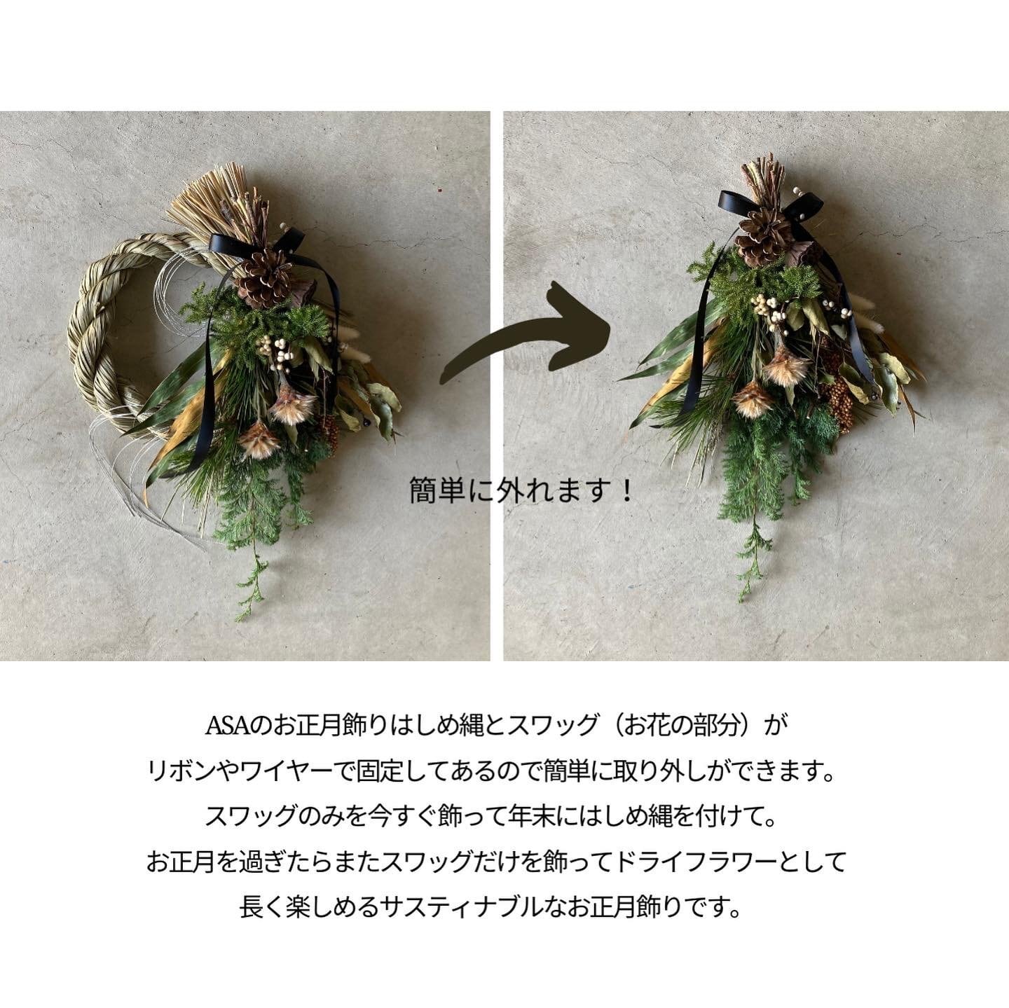お正月を過ぎたらまたしめ縄を外して、ドライフラワースワッグとして長く飾って頂けます。