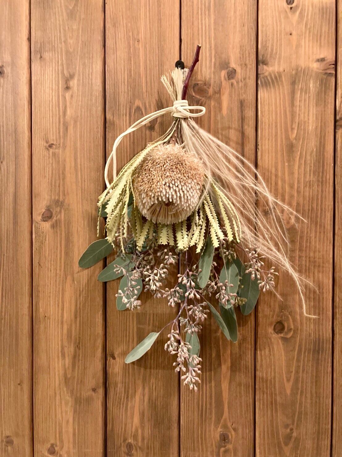 個性的なバンクシアを、ふわふわなフェザーグラスとユーカリで優しいスワッグに♡