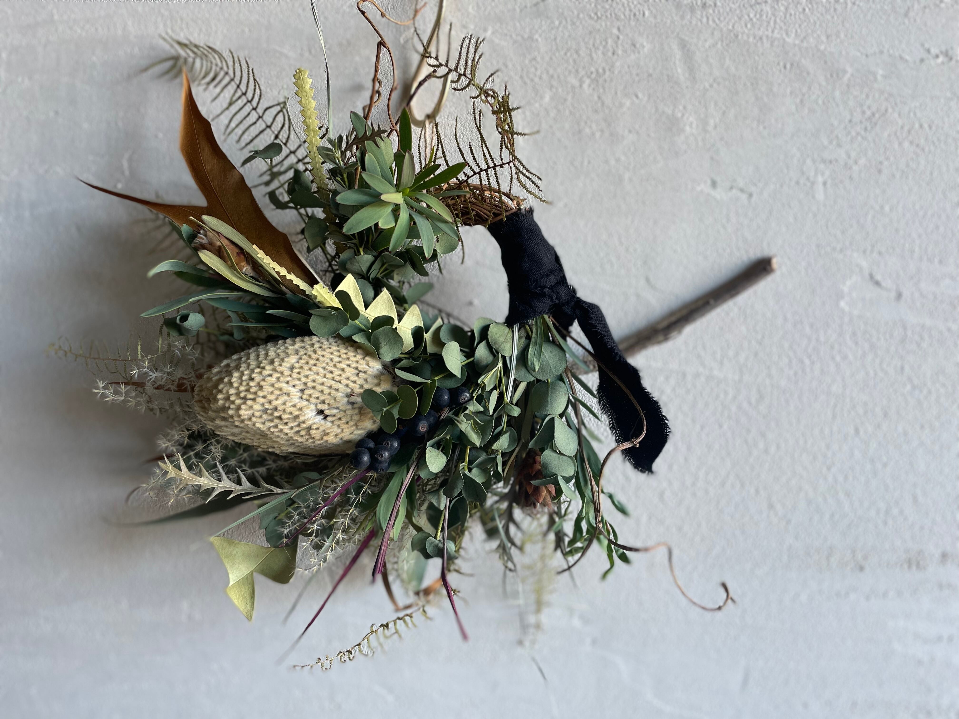 小さめのリースベースにインパクトのあるバンクシア、ユーカリなどたくさんのグリーンを使って制作しました。